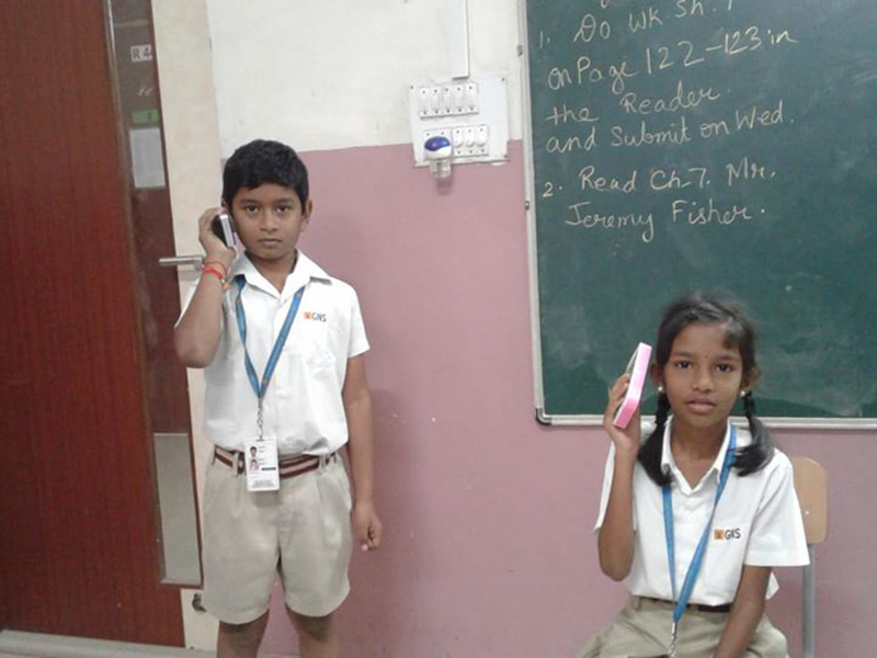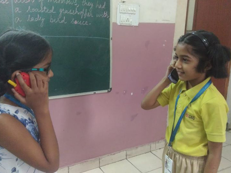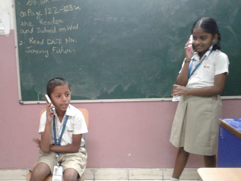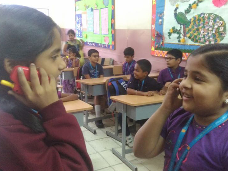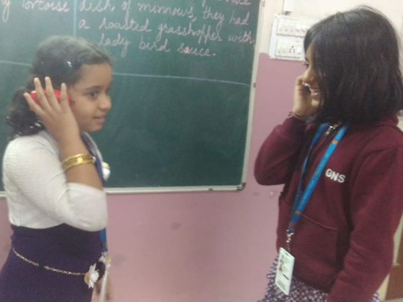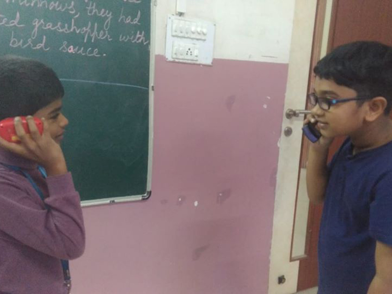An interesting activity on Telephonic conversation was done in class for the third graders. The children were told to find partners, and the pair would have a phone conversation on two topics, inviting for a birthday party or going on a picnic. The conversation was noted and later corrected by the teacher on its grammatical errors. The tone of language and the use of formal words were taught. Though it initially seemed like a casual activity, the children realized their areas of grammatical error. A fun activity to watch them holding toy phones and talking very seriously into it.