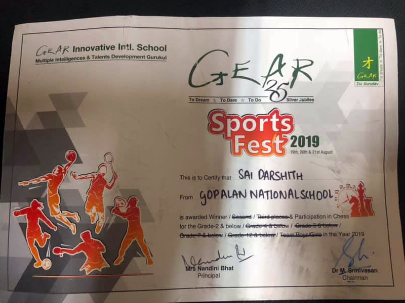 A Proud Moment....Sai Darshith of Standard 2 has been awarded 'First place for Chess Competition 'organised by Gear International School.Well Done!!!!