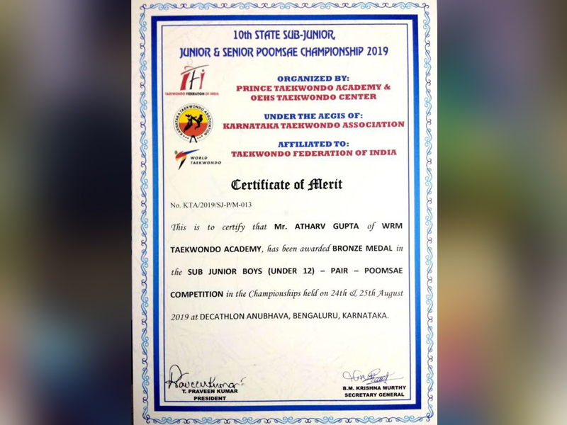 Atharv has won two medals in 10th Karnataka State level Taekwondo Championship, held on 24th and 25th August in Bangalore.