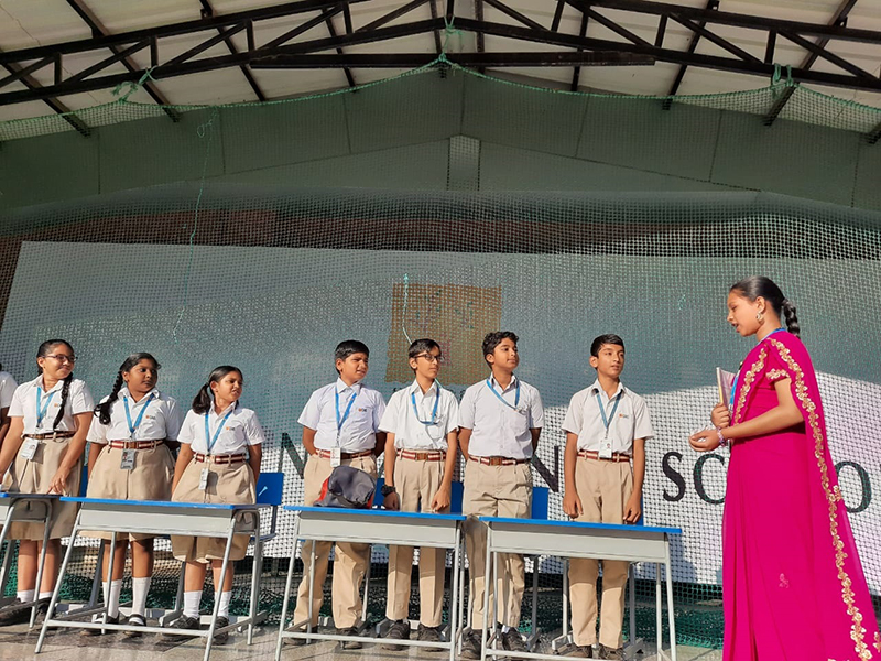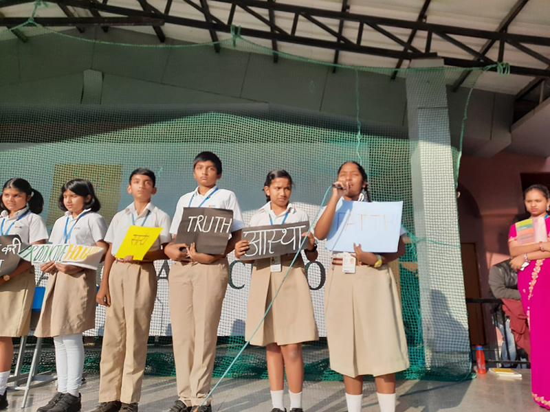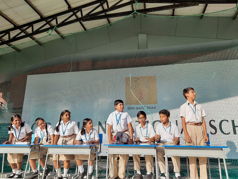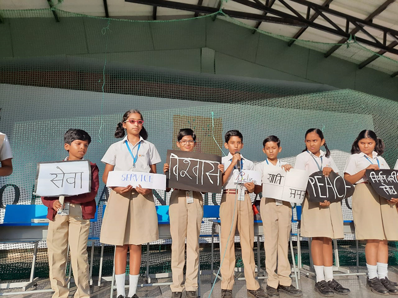 In today's assembly, the contribution of Mahatma Gandhiji towards the nation were stated by quotes, morals and principles that were followed by Gandhiji. A small skit was performed on the principle of being the change that one would want to see in the world. This skit emphasised on being empathetic, helpful, co-operative and productive to build unity in class, school, society and our nation.